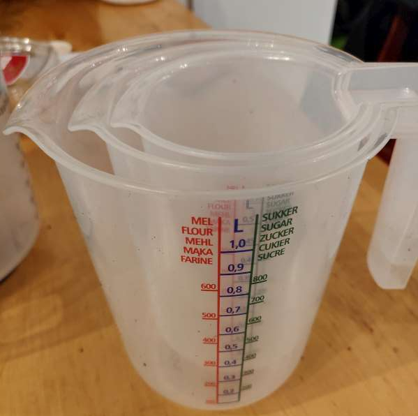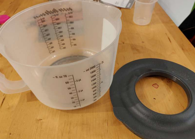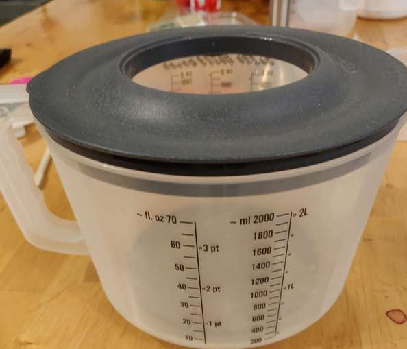 Chez Action j’ai trouvé un bol doseur en plastique PP 5. Il est intéressant car il y a un couvercle antiprojection, il a une poignet et il est plutôt grand. En saponification à froid (SAF), il faut être très précautionneu.x.se car il y a de la soude et celle-ci est corrosive. Dans ce récipient j’y mets mes HV et beurres à fondre.