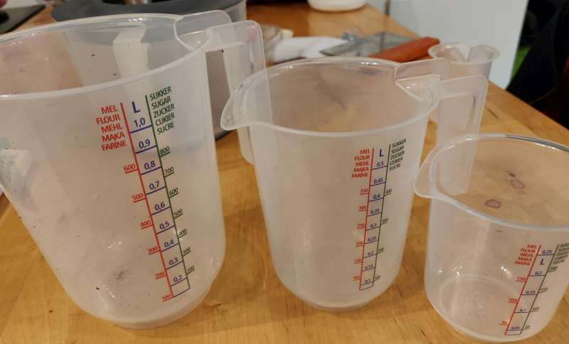 Pour ma solution de soude, je mets dans des pots en verre recyclés mon eau d’un côté (dans le plus grand pot) et la soude de l’autre.